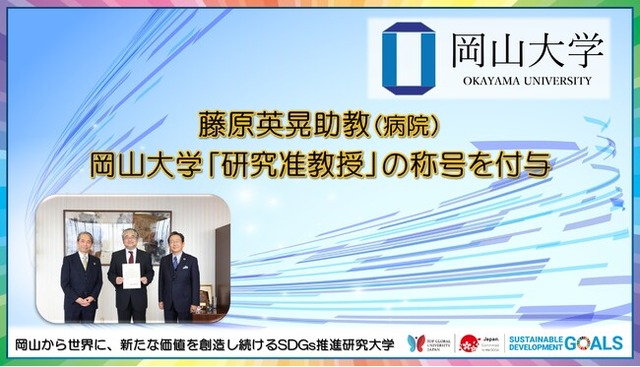 国立大学法人岡山大学(本部:岡山市北区、学長:槇野博史)は、岡山大学病院の藤原英晃助教を2022年9月15日に研究准教授として選任し、2022年12月22日に研究准教授の称号付与式を本学津島キャンパスの本部棟学長室にて開催しました。