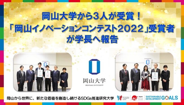 2022年11月26日に革新的なビジネスのアイデアを競う「岡山イノベーションコンテスト2022」が岡山シンフォニーホール(岡山市北区)において開催され、ビジネスプラン部門一般の部で本学学術研究院医歯薬学域の高橋賢助教が大賞に、同部門大学・専門学校生の部で大学院教育学研究科の宮本あゆはさんが大賞に、経済学部の脇田康之亮さんがMASC賞(※)にそれぞれ輝きました。