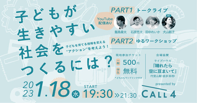 日本初(※1)の公共訴訟支援に特化したウェブプラットフォームCALL4(コールフォー)(運営:特定非営利活動法人CALL4、代表理事:谷口太規)は、2023年1月18日に“子どもを育てる現場を変える”をテーマにしたイベント「子どもが生きやすい社会をつくるには? ~子どもを育てる現場を変える“アクション”を考えよう!」を開催いたします。