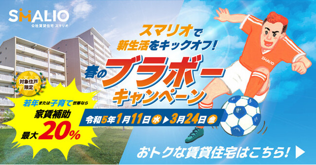 大阪府内において公社賃貸住宅SMALIO(スマリオ)を提供する大阪府住宅供給公社(本社:大阪市中央区、理事長:山本 讓、以下、公社)は、新たにご入居される方を対象に、さまざまな特典を用意した『スマリオで新生活をキックオフ! 春のブラボーキャンペーン』の申込受付を本日より開始したことをお知らせします。