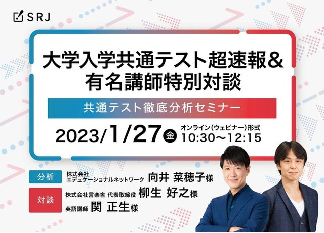 ICT教材の企画開発・販売を行なう株式会社SRJ(本社:東京都中央区、代表:堀川直人、以下「SRJ」)は、2023年1月27日、全国の学習塾・学校・スクール関係者を対象に、無料オンラインセミナー『大学入学共通テスト超速報&有名講師特別対談』を開催いたします。