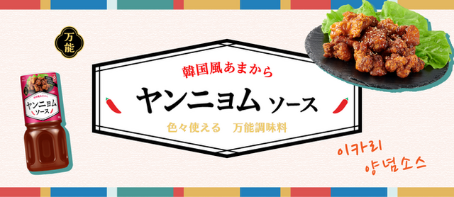 近年「ヤンニョムチキン」が人気で韓国フライドチキン専門店も数多くできており、唐揚げ専門店や惣菜売り場でも「ヤンニョム」が唐揚げの味付けとして根付いてきています。新商品『ヤンニョムソース280』は、韓国料理の味付けのもととなる調味料「ヤンニョム」を日本人の味覚に合うように仕上げ、唐揚げにからめるだけでヤンニョムチキンもできて、家庭で簡単に韓国風の甘辛い料理をいろいろ作れるソースとして開発した万能調味料です。