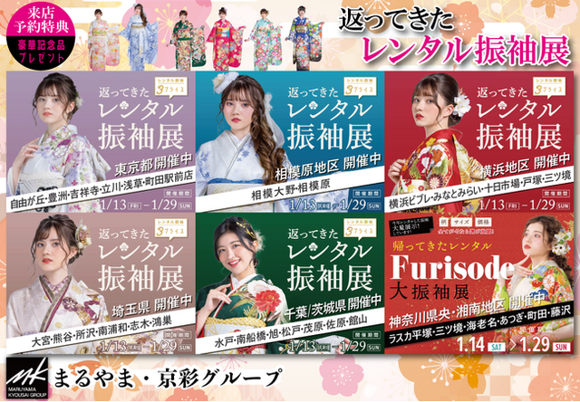 着物呉服の「まるやま・京彩グループ」は「これから成人を迎えるお嬢様に向けて早期予約をサポート」するためのキャンペーン『返ってきたレンタル振袖展』を2023年1月に開催いたします。1年のうち1月は、レンタル振袖が一斉に返ってくる時期。つまり、1年で一番選択できる振袖の種類が豊富ということで、今ならほぼ選び放題! 当グループにおいても毎年人気のキャンペーンとなっています。「Web来店予約特典」「最大4万円オトクなプライス」「新作振袖コレクション」など魅力的な企画も多数ご用意しておりますので、この機会をご活用ください。