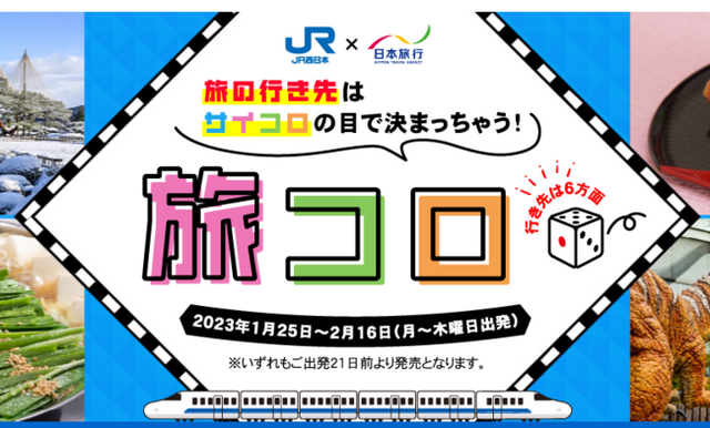 「旅コロ」はJR往復(新幹線または特急列車)と宿泊をセットにした1泊2日のフリープラン商品で、旅先は富山・金沢・福井・岡山・広島・博多の6方面のいずれかとなり、ご予約後3日以内に決定方面をお知らせします。旅先が決まるまでのドキドキ感と偶然にも巡り合う旅先の新たな魅力発見によるワクワク感、そしてお手軽な価格設定でイロイロと楽しめる新しい旅の形を提案します。