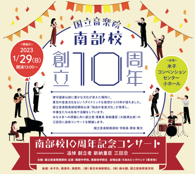 国立音楽院 南部校(鳥取県西伯郡南部町阿賀 314-3)は、開校10周年を記念して、2023年1月29日(日)に「南部校10周年記念コンサート ―追悼 創立者 新納重臣 三回忌―」を開催致します。(会場:米子コンベンションセンター 小ホール)