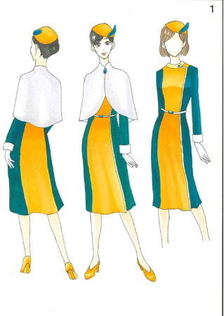 受賞した本学ファッションデザイン科1年の池田彩恵さんは、今回のデザインに関して「日南市の鳥であるカワセミからイメージを膨らませ、カラフルで可愛らしい雰囲気と活発なイメージから大人の女性が身に纏うなら、どのように表現したらいいかを考えました。カワセミは「青い宝石」とも呼ばれているのでボタンやブローチ、ベルトにポイントとして入れてみました。」とのことです。