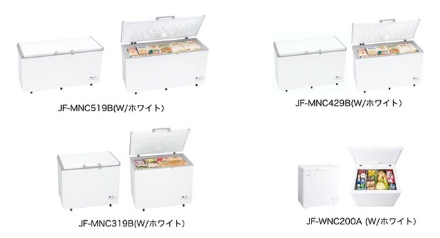 519L上開き式冷凍庫(JF-MNC519B)、429L上開き式冷凍庫(JF-MNC429B)、319L上開き式冷凍庫(JF-MNC319B)、200L上開き式冷凍庫(JF-WNC200A)の概要は以下の通りです。