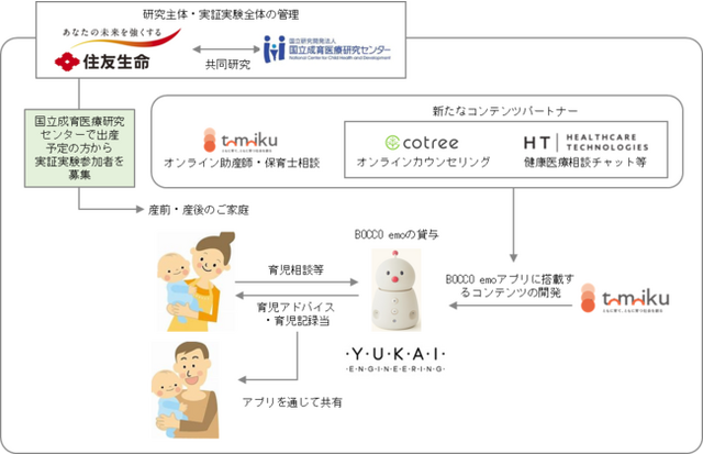 本サービスへの取り組みは、住友生命が株式会社三菱総合研究所(代表取締役社長:籔田 健二)の運営する未来共創イニシアティブ(ICF)に参画したことから始まり、「産後うつを未然に防ぎ、明るい子育て生活を応援する」というコンセプトを掲げて、ユカイ工学とトモイクとの連携によって進められてきました。