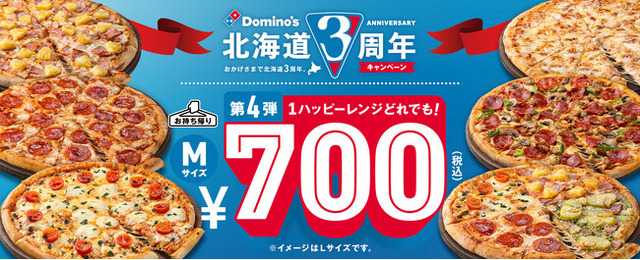 株式会社ドミノ・ピザ ジャパン(代表取締役:ジョシュア・キリムニック、CEO:マーティン・スティーンクス、本社:東京都品川区、以下:ドミノ・ピザ)が展開する国内No.1シェアを誇る宅配ピザチェーン ドミノ・ピザは、「北海道3周年キャンペーン」の第4弾として、1ハッピーレンジMサイズ全6種類がお持ち帰り限定で700円になる『1ハッピーレンジどれでも!700円』を、2023年1月19日(木)から29日(日)まで、北海道内のドミノ・ピザ 全33店舗※にて開催します。ドミノ・ピザの人気定番商品を、おいしくおトクにお楽しみください。※1月26日オープンの福住店を含む