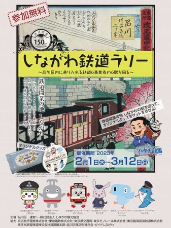 品川区は2月1日~3月12日、区内に乗り入れる6鉄道事業者(京浜急行電鉄株式会社・東急電鉄株式会社・東京都交通局・東京モノレール株式会社・東京臨海高速鉄道株式会社、東日本旅客鉄道株式会社首都圏本部)協力を得て、鉄道開業150周年記念「しながわ鉄道ラリー」を開催します。