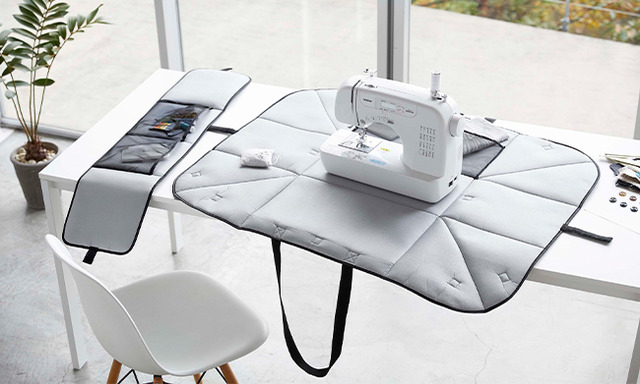 開くとアイロンマットになり、アイロン掛けしながらミシン掛けできます。