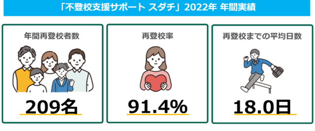 不登校をはじめとした教育課題の解決を支援する株式会社スダチ(所在地:東京都渋谷区、代表取締役:小川涼太郎、以下スダチ)が提供する3週間で不登校児を再登校に導く「不登校支援サポート スダチ(URL:https://sudachi.support/3weeks/)」は、2022年1月~12月末までの1年間で、日本全国の7歳から18歳までの不登校の子ども209名の自発的再登校をサポートしたことをお知らせします。2020年7月の支援開始以降、累計実績※は329名、再登校率91%、平均再登校日数(支援開始から再登校するまでの日数)は18日となります。*2020年7月~2022年12月累計