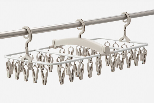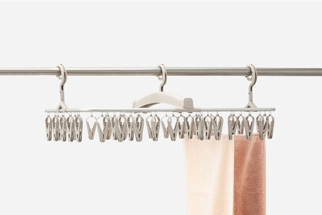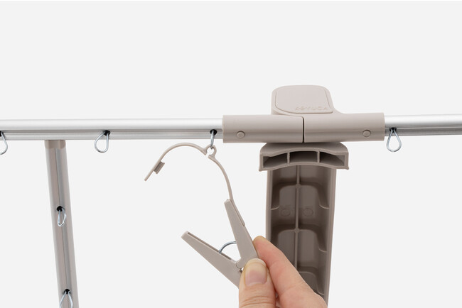 左右のサイドフックでピンチハンガーを3点で支える構造のため、