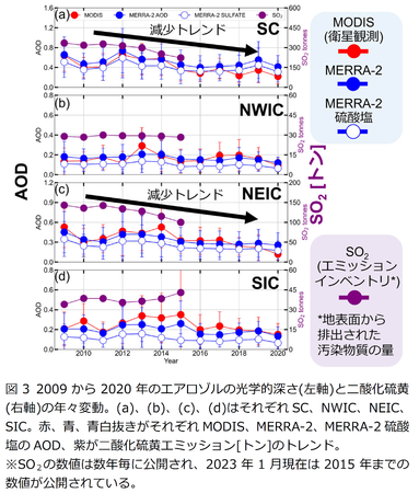 最後にインドシナ半島の年々変動について解析を行いました。インドシナ半島の北東には中国が位置しており、モンスーンの影響で10月にエアロゾルの越境輸送が確認されています(図1)。そこで、中国南部(SC)とインドシナ半島のエアロゾルの光学特性の関係性の解析を2009年から2020年にかけて行いました(図3)。特に、中国南部風下の北東インドシナ半島(NEIC)では硫酸塩AODが減少傾向にありました。硫酸塩エアロゾルの前駆物質である二酸化硫黄(SO2)の排出量が中国南部で減少傾向であることから、インドシナ半島の大気質の改善に中国からの人為的なエアロゾルが大きく寄与していることが示唆されました。