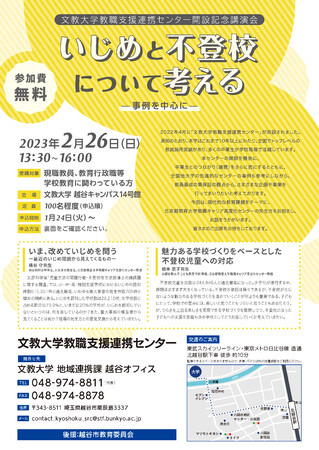 現代的な教育課題をテーマに、今回は「いじめと不登校について考える-事例を中心に-」というタイトルで、元京都教育大学教職キャリア高度化センターの先生方をお招きし、お話しをうかがいます。皆さまのご出席をお待ちしております。
