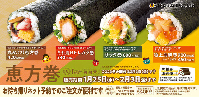 寿司レストランチェーンを展開する元気寿司株式会社(本社:栃木県宇都宮市 代表取締役会長兼社長 藤尾 益雄)は、全国の元気寿司・魚べい・千両にて2023年1月25日(水)から2月3日(金)の10日間限定で、4種の『恵方巻』を販売いたします。恵方巻は、すべて希少な初摘み海苔を使用し、店舗で手作りしております。また、商品受取日の3日前までに「お持ち帰りネット予約」をされた方を対象に、各恵方巻商品が5%割引の特別価格で楽しめる『早割』を実施いたします。