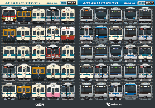 ・小田急線各駅で無料配布する専用台紙をお持ちいただき、対象の15駅で通勤車両がデザインされた駅スタンプを集めていただくスタンプラリーです