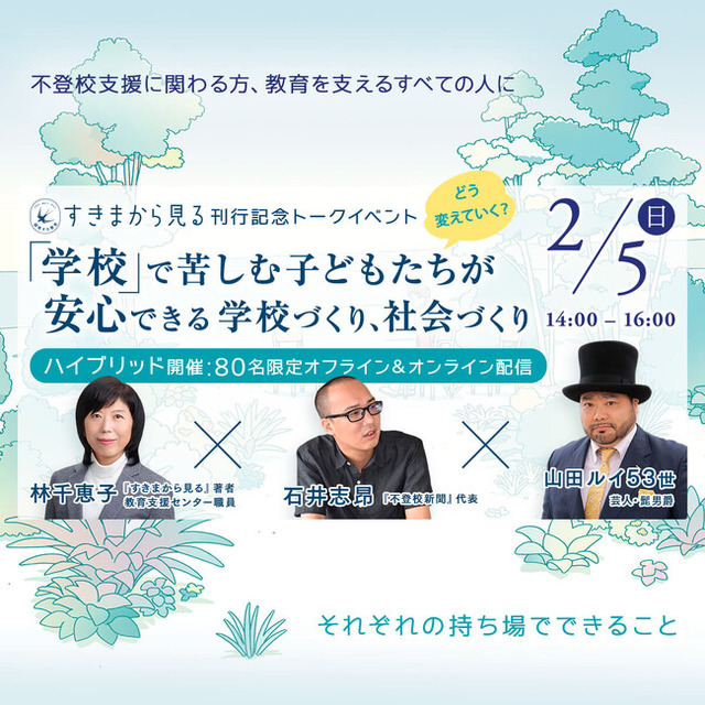 株式会社東洋館出版社(本社:東京都千代田区、代表取締役社長:錦織圭之介)は、2023年2月5日(日)に、新刊『すきまから見る』(林千恵子・著)の刊行記念トークイベントを開催します。著者・林千恵子氏×『不登校新聞』代表・石井志昂氏×髭男爵・山田ルイ53世(芸人)が参加者とともに「不登校」を考えます。