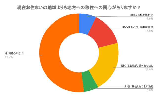 「現在お住まいの地域よりも地方への移住・二拠点生活への関心がありますか?」という問いに対し、「現在、移住を検討中(7%)」、「関心はあるが、時期は未定(14%)」、「関心はあるが、調べたりはしていない(21%)」を合わせた42%のママが地方移住への関心が高いことがわかりました。