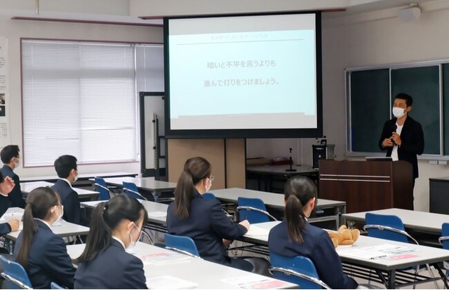 今回、岡山東商業高校からの依頼で出張起業セミナーが実現。高校1年生~3年生まで、21名が参加しました。