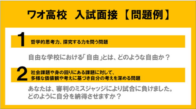 ワオ高校においても、従来の5教科の筆記試験はなく、答えのない問題を出題している。