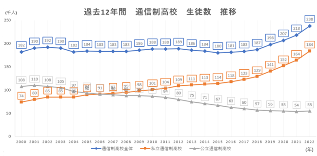 ●2022年、全日制は300万人(91%)、定時制は8万人(2%)。通信制の生徒数は23万人(7%) 以上。