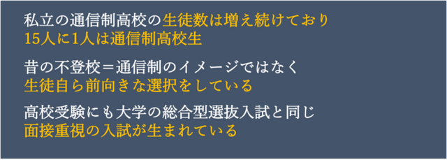 2015年から急激に私立の通信制高校の生徒数は増え続けており、2022年では、14~15に1人は通信制高校の生徒で、1クラスに2人は通信制高校を卒業するスケールです。いまや通信制高校は、旧来のイメージにある不登校=通信制ではなく、生徒自ら前向きな選択をしています。