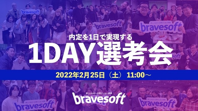 bravesoftが行う1DAY選考会は、週末の土曜日・日曜日などの休日を利用して、1日で「会社説明」「懇親会」「面接」「適性検査」「内定~条件提示」までを行う採用イベント(1DAY選考会)となっております。