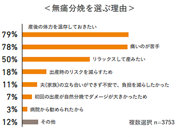 また、無痛分娩を選んだ人に理由を聞くと、出産時の痛み軽減に加えて、産後の体力温存のためという人が多数。「産後の体力を温存しておきたい」「痛いのが苦手」がどちらも約8割で、無痛分娩に決めた理由の2トップでした。痛みを軽減し疲労が少なくて済むと回復が早い傾向にあり、育児や生活が少しでも楽になるという声が多く集まりました。「コロナの影響で主人の付き添いができない可能性が高いので、一人で陣痛耐えるのはきびしいかな?と思い無痛分娩の予定です」「立ち会いができず一人での出産になるので、なるべくつらくないように無痛分娩にする予定」など、コロナ禍を理由に無痛分娩を検討する妊婦さんもいるようです。