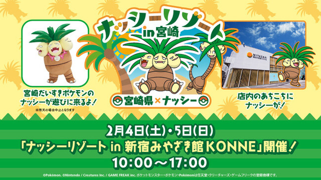 本企画は、宮崎県内で行っている「ナッシーリゾート in 宮崎」の取組の一環で、東京では初めてのイベント開催となります。イベント当日は、宮崎だいすきポケモン「ナッシー」が、2日間で計8回(予定)のグリーティングを実施するほか、店内では宮崎県各地の特産品とナッシーがコラボした「ナッシーリゾート in 宮崎」コラボ商品を販売します。期間中、「新宿みやざき館KONNE」店内は「ナッシー」をあしらったデザインで装飾し、イベントを盛り上げます。