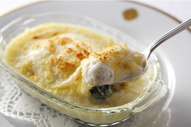 けるようグラタンに仕立てました。ホウレン草とホワイトソースが牡蠣の美味しさを引き立てます。