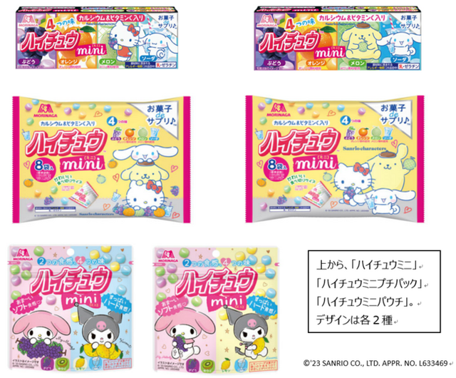 「ハイチュウミニ」「ハイチュウミニプチパック」は、ぶどう・オレンジ・メロン・ソーダの4つの味でビタミンCとカルシウムが入ったミニザイズのハイチュウです。本商品には、シナモロール、ポムポムプリン、ハローキティをデザインしました。