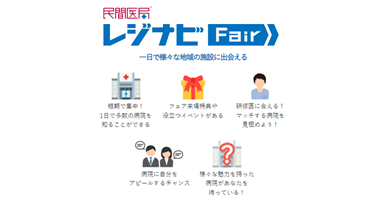 「レジナビフェア」は、全国から多くの病院が出展し、来場者の医学生や研修医に病院の情報を提供する日本最大規模の研修病院合同説明会です。2002年にスタートした同イベントは、全国7会場で実施しており、参加病院延べ1,000施設、来場者数延べ10,000人(2019年実績)を誇ります。2020年からは、全国から病院が集結するWeb説明会「レジナビフェア オンライン」の提供も開始し、コロナ禍でお困りの医学生・医療機関から大きな反響を得ています。