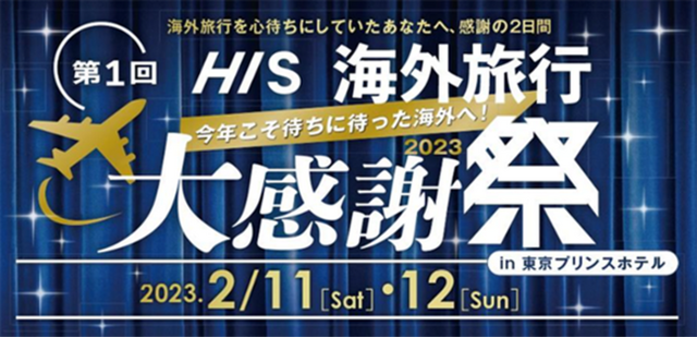 株式会社エイチ・アイ・エス(本社:東京都港区 以下、HIS)は、国際往来の再開にあたり海外旅行を心待ちにされている皆様に向けて、「第1回HIS海外旅行大感謝祭」を2023年2月11日(土・祝)・12日(日)の2日間、東京プリンスホテルにて開催いたします。