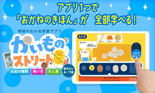 そうした、家庭でのお金学習をばっちりサポートするのが、本日リリースの『学研のおかね学習アプリ かいものストリート』です! 「お金の種類と計算」がスモールステップで学べるミニゲームと、お買い物によって進むストーリーで「お金の使い方」がゲーム感覚で楽しく身につきます。