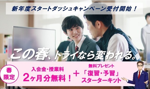 株式会社トライグループ(本社:東京都千代田区、代表取締役:平田 友里恵)の「家庭教師のトライ」「個別教室のトライ」「トライプラス」「オンライン個別指導塾」は、新年度への不安を払拭し、全国の学生が最高のスタートを切れるよう「新年度スタートダッシュキャンペーン」を実施します。本キャンペーンは、どなたでも入会金+授業料2ヶ月分が無料。また、新学年の学習をサポートする「復習・予習」スターターキットも無料でプレゼントいたします。受付期間は、2023年2月1日(水)~3月31日(金)。