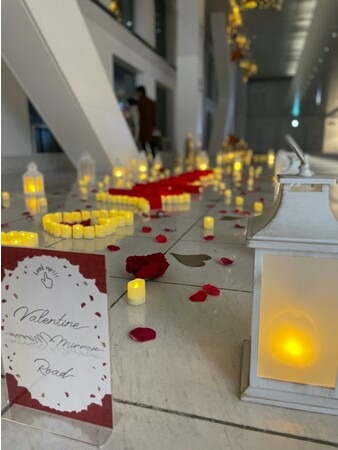 今年のテーマは「All my love ~ありったけの愛を込めて~」で、そばにいる大切な人や好きな芸能人、キャラクターなどのいわゆる「推し」に愛や想いを伝えたくなる雰囲気を演出しようと、約1400のLEDキャンドルと薔薇を用いて6つのオブジェを展示します。屋内展望エリアには、キャンドルで装飾したウェルカムボード、風船やテディベアの人形などで装飾した想いを伝えるフォトスポットなどを設置します。また「推し活」がブームになる中、購入した「推し色」のハートロックを置いて、観賞や写真撮影ができる全9色のキャンドルオブジェなども制作しています。さらに、併設のカフェ「cafe SKY40」の各席にもLEDキャンドルを置き、空間全体の雰囲気を演出しました。イベントは2月1日から14日までの2週間にわたり開催されます。