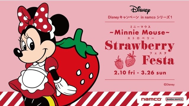 株式会社バンダイナムコアミューズメントは、『Disney』との初のコラボキャンペーン『Disney キャンペーン in namco シリーズ1 ~Minnie Mouse~ Strawberry Festa』を開催します。「ミ(3)ニー(2)」と読む語呂合わせと、女の子の節句「ひな祭り」と同じ時期などから、3月2日はミニーの日と言われています。本キャンペーンにあわせ、オリジナルの描き下ろしデザインのミニーマウスを使った「プレミアムいちごクッション」や「プレミアムタオルギフトセット」など、季節の果物である苺をかわいらしくあしらった景品が登場します。