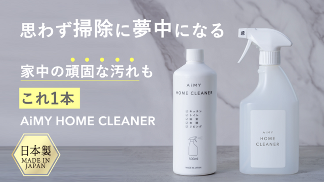 キッチンも、リビングも、トイレも浴槽も。衣類のシミまでこれ1本で。サッとスプレーして拭きとるだけで、しっかり汚れを落とします。場所別の洗剤は不要。お掃除を手軽に、シンプルにするマルチクリーナー「AiMY ホームクリーナー」」を、2023年2月6日(月)~2023年3月26日(日)の期間限定で株式会社マクアケ(所在地:東京都渋谷区、代表取締役社長:中山 亮太郎)が展開する日本最大級の応援購入サービス「Makuake」において、先行販売致します(ページURL:https://www.makuake.com/project/aimy_home_cleaner/)。