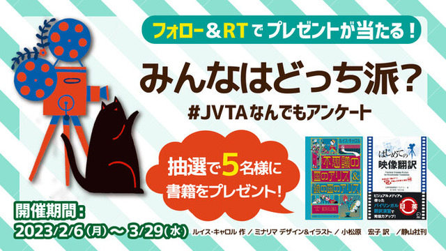 日本映像翻訳アカデミー株式会社(本社:東京都中央区、代表取締役:新楽直樹、以下「JVTA」)は、公式Twitter(@JVTA_TOKYO)にてフォロー&リツイートキャンペーン「みんなはどっち派? #JVTAなんでもアンケート」を、2023年2月6日(月)から2023年3月29日(水)まで実施します。アカウントをフォローして対象ツイートをリツイートしてくれた方の中から抽選で1名にJVTA修了生が翻訳を担当した『不思議の国のアリス&鏡の国のアリス〈ミナリマ・デザイン版〉』(静山社)を、4名にJVTAが執筆した映像翻訳の入門書『はじめての映像翻訳』(アルク)をプレゼントします。