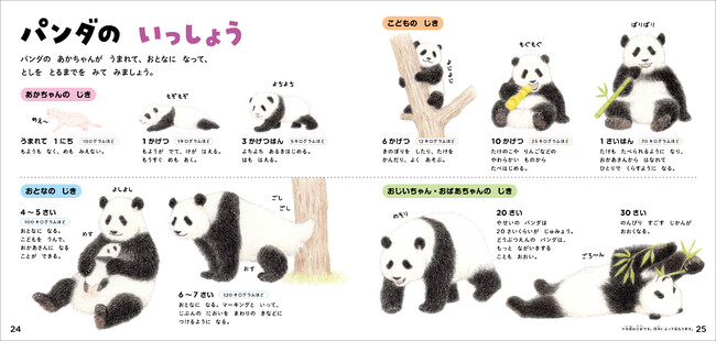 『パンダのずかん』の「パンダのいっしょう」のページでは、メスのパンダは4~5歳で大人になり、お母さんパンダになれること、30歳はおじいちゃんパンダということがわかります。