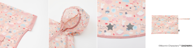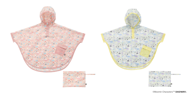 子ども自身が着脱しやすく、長い間着用できるポンチョタイプを採用。雲の上で過ごすムーミンたちのテキスタイルを使用した、雨の日のお出かけを彩るアイテムです。