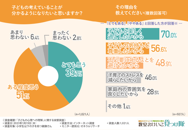 今回の調査では、約9割の方が子どもの考えていることが分かるようになりたいと思っていることが明らかになりました。その理由としては、7割の方が子どもと楽しく過ごしたいからと回答しました。