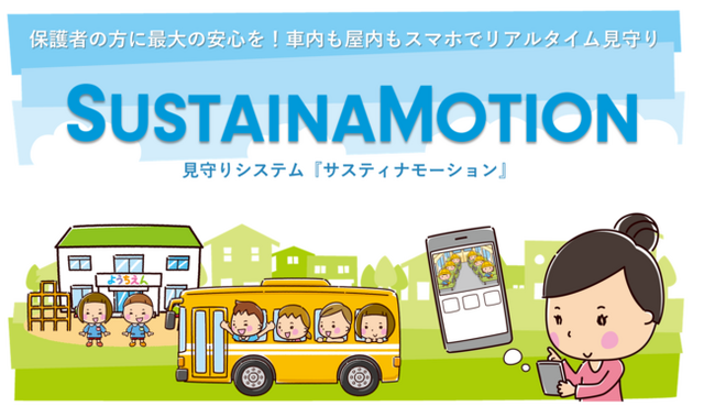 そんなニーズにお応えすべく、送迎バス車内の様子も、施設屋内の様子も、いつでもスマートフォンでリアルタイムに見守ることができる新サービス、見守りシステム「サスティナモーション」が誕生しました。