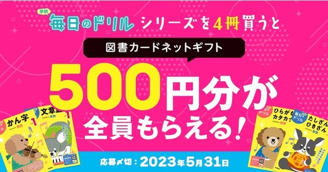 毎日のドリルを含む対象商品を購入し、キャンペーンシールから学研教室の無料体験学習を申込み、体験を完了すると抽選で1,000名様に、1,000円分の図書カードネットギフトをプレゼント!