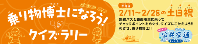 この度、そのメインイベントとして、両備グループの路線バス・路面電車事業者(両備バスカンパニー、岡山電気軌道株式会社、株式会社井笠バスカンパニー)にて、2月11日(土)から 2月28日(火)の期間中の土日祝に、「乗り物博士になろう!クイズラリー」を実施しますので、お知らせいたします。