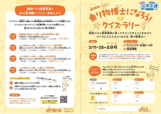 クリアしたお子さまにはプレゼントを贈呈&期間中の日曜日・祝日に実施される路線バス・路面電車のイベントにもご参加いただけます!めざせ、乗り物博士!!