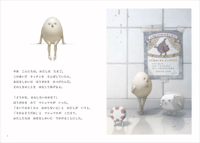 主人公は、ある日突然めざめた「たまご」。初めて動いたり、考えたりするなかで、自分の言葉で話すことを獲得していきます。ちょっとクセの強いたまごが繰り広げる物語は、シュールでユーモアたっぷり。たまごが何気なく発する一言や疑問が、読み手の思考を刺激してくれます。