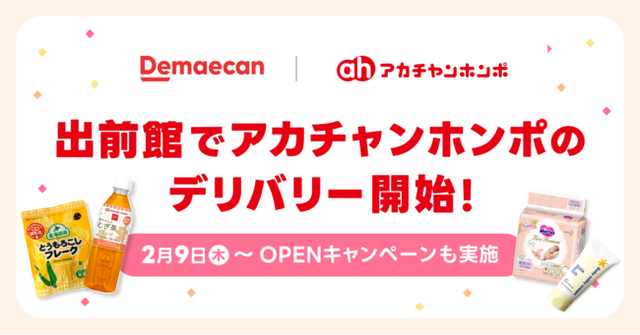 株式会社赤ちゃん本舗(本社:大阪府大阪市)が運営する「アカチャンホンポ」は、株式会社出前館(本社:東京都渋谷区)が運営する日本最大級のデリバリーサービス「出前館」で、デリバリーを開始いたします。「出前館」のベビー用品専門店との取り組みは今回が初めてとなります。また、今回のデリバリー開始を記念し、2023年9日(木)~15日(水)までアカチャンホンポOPENキャンペーンを実施いたします。