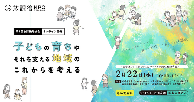 「放課後はゴールデンタイム」をビジョンに活動する特定非営利活動法人 放課後NPOアフタースクール(代表理事:平岩国泰/本部:東京都文京区/以下、放課後NPOアフタースクール)は、2023年2月22日(水)10:00-12:15に、小学生の放課後の居場所運営に関わるスタッフの方、自治体担当者、まちづくり・産業振興に携わる方を主な対象に、第3回オンライン放課後勉強会「子どもをまんなかに!私たちで描くこれからの放課後~子どもの育ちやそれを支える地域のこれからを考える~」を開催します。